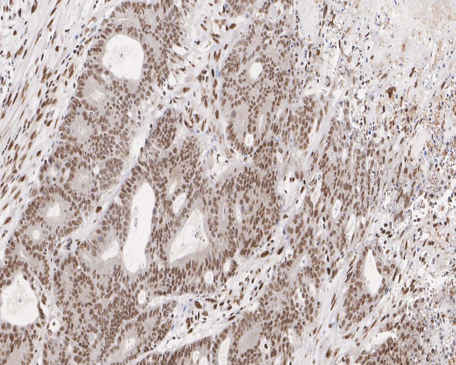 Immunohistochemical analysis of paraffin-embedded human colon cancer tissue with Rabbit anti-MLH1 antibody (HA750749) at 1/400 dilution.