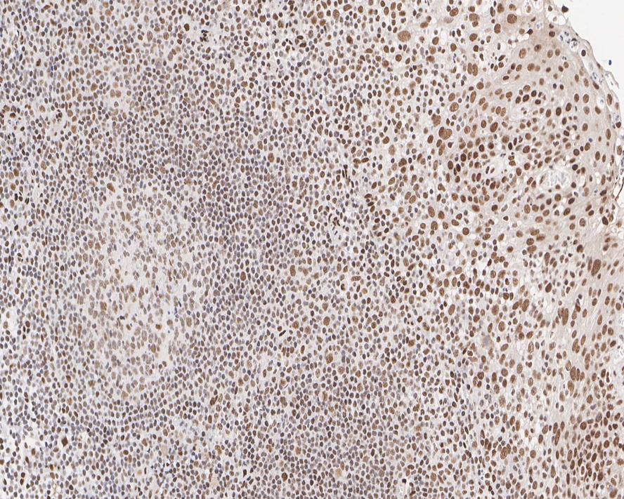 Immunohistochemical analysis of paraffin-embedded human tonsil tissue with Rabbit anti-MLH1 antibody (HA750749) at 1/400 dilution.