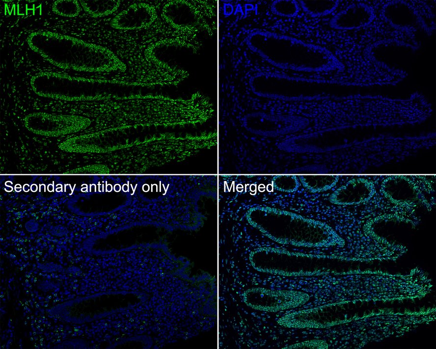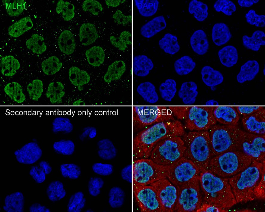 Cells were fixed in 100% precooled methanol for 5 minutes at room temperature, then blocked with 1% BSA in 10% negative goat serum for 1 hour at room temperature. Cells were then incubated with Rabbit anti-MLH1 antibody (HA750749) at 1/100 dilution in 1% BSA in PBST overnight at 4 ℃. Goat Anti-Rabbit IgG H&L (iFluor™ 488, HA1121) was used as the secondary antibody at 1/1,000 dilution. PBS instead of the primary antibody was used as the secondary antibody only control. Nuclear DNA was labelled in blue with DAPI.