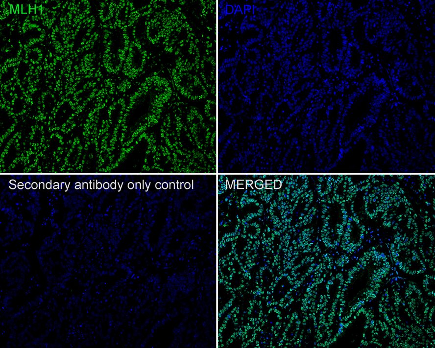 Immunofluorescence analysis of paraffin-embedded human colon cancer tissue labeling MLH1 with Rabbit anti-MLH1 antibody (HA750749) at 1/50 dilution.