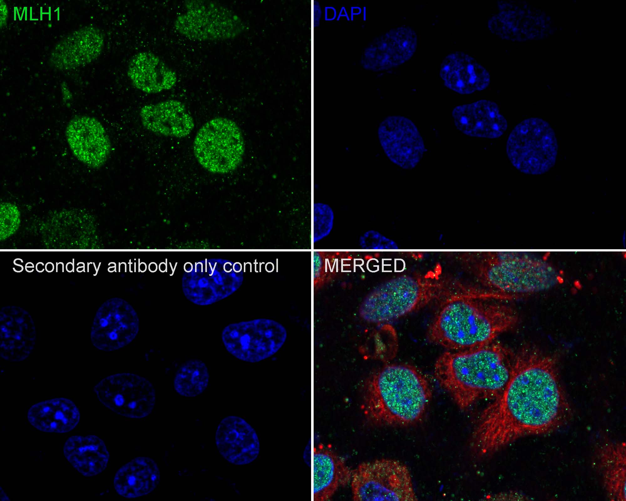 Cells were fixed in 4% paraformaldehyde for 20 minutes at room temperature, permeabilized with 0.1% Triton X-100 in PBS for 5 minutes at room temperature, then blocked with 1% BSA in 10% negative goat serum for 1 hour at room temperature. Cells were then incubated with Rabbit anti-MLH1 antibody (HA750749) at 1/100 dilution in 1% BSA in PBST overnight at 4 ℃. Goat Anti-Rabbit IgG H&L (iFluor™ 488, HA1121) was used as the secondary antibody at 1/1,000 dilution. PBS instead of the primary antibody was used as the secondary antibody only control. Nuclear DNA was labelled in blue with DAPI.