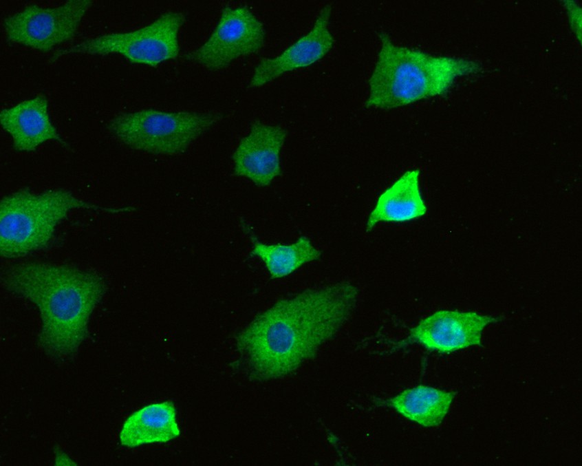 ICC staining of MMP-7 in HT-29 cells (green). Formalin fixed cells were permeabilized with 0.1% Triton X-100 in TBS for 10 minutes at room temperature and blocked with 10% negative goat serum for 15 minutes at room temperature. Cells were probed with the primary antibody (HA500305, 1/50) for 1 hour at room temperature, washed with PBS. Alexa Fluor®488 conjugate-Goat anti-Rabbit IgG was used as the secondary antibody at 1/1,000 dilution. The nuclear counter stain is DAPI (blue).
