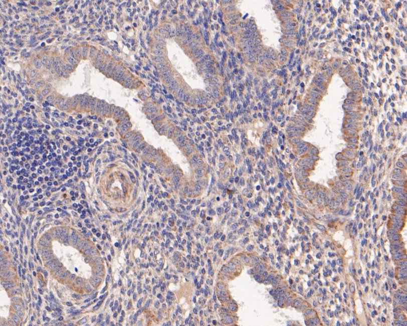 Immunohistochemical analysis of paraffin-embedded human uterus tissue using anti-MMP7 antibody. The section was pre-treated using heat mediated antigen retrieval with Tris-EDTA buffer (pH 9.0) for 20 minutes.The tissues were blocked in 5% BSA for 30 minutes at room temperature, washed with ddH2O and PBS, and then probed with the primary antibody (HA500305, 1/100) for 30 minutes at room temperature. The detection was performed using an HRP conjugated compact polymer system. DAB was used as the chromogen. Tissues were counterstained with hematoxylin and mounted with DPX.