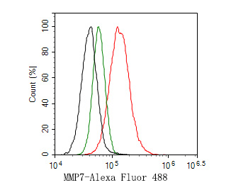 Flow cytometric analysis of MMP-7 was done on A549 cells. The cells were fixed, permeabilized and stained with the primary antibody (HA500305, 1ug/ml) (red) compared with Rabbit IgG, monoclonal - Isotype Control (green). After incubation of the primary antibody at +4℃ for 1 hour, the cells were stained with a Alexa Fluor®488 conjugate-Goat anti-Rabbit IgG Secondary antibody at 1/1,000 dilution for 30 minutes at +4℃ (dark incubation).Unlabelled sample was used as a control (cells without incubation with primary antibody; black).