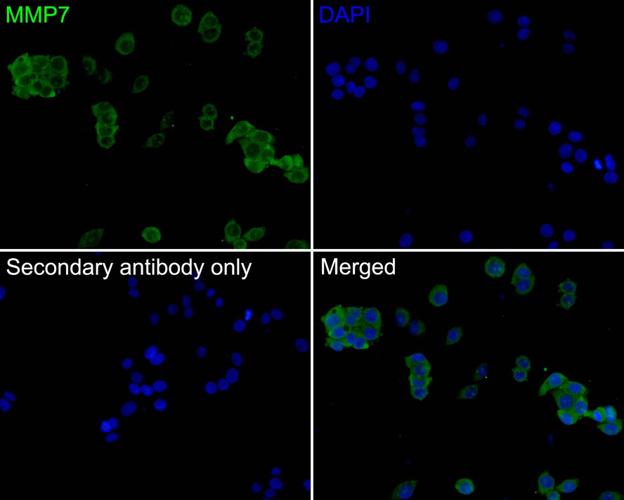 ICC staining of MMP-7 in A549 cells (green). Formalin fixed cells were permeabilized with 0.1% Triton X-100 in TBS for 10 minutes at room temperature and blocked with 10% negative goat serum for 15 minutes at room temperature. Cells were probed with the primary antibody (HA500305, 1/50) for 1 hour at room temperature, washed with PBS. Alexa Fluor®488 conjugate-Goat anti-Rabbit IgG was used as the secondary antibody at 1/1,000 dilution. The nuclear counter stain is DAPI (blue).