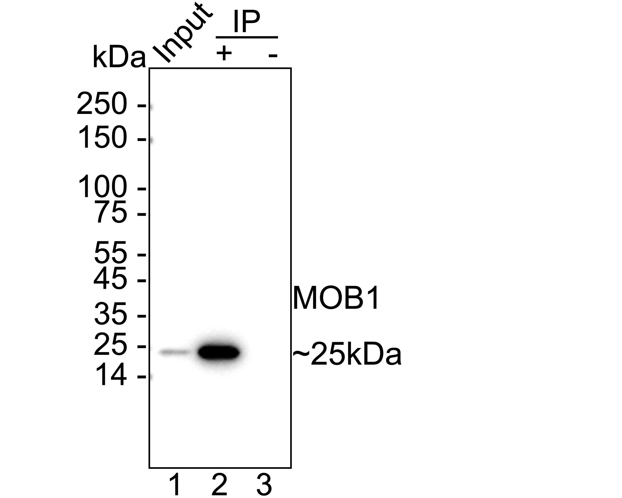 MOB1 was immunoprecipitated from 0.2 mg HeLa cell lysate with HA723919 at 2 µg/10 µl beads. Western blot was performed from the immunoprecipitate using HA723919 at 1/5,000 dilution. HRP Conjugated Anti-Rabbit IgG for IP Nano-secondary antibody at 1/5,000 dilution was used for 1 hour at room temperature.