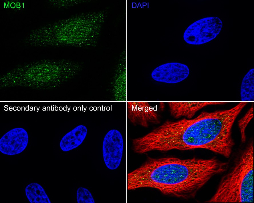 Cells were fixed in 4% paraformaldehyde for 15 minutes at room temperature, permeabilized with 0.1% Triton X-100 in PBS for 15 minutes at room temperature, then blocked with 1% BSA in 10% negative goat serum for 1 hour at room temperature. Cells were then incubated with Rabbit anti-MOB1 antibody (HA723919) at 1/100 dilution in 1% BSA in PBST overnight at 4 ℃. Goat Anti-Rabbit IgG H&L (iFluor™ 488, HA1121) was used as the secondary antibody at 1/1,000 dilution. PBS instead of the primary antibody was used as the secondary antibody only control. Nuclear DNA was labelled in blue with DAPI.