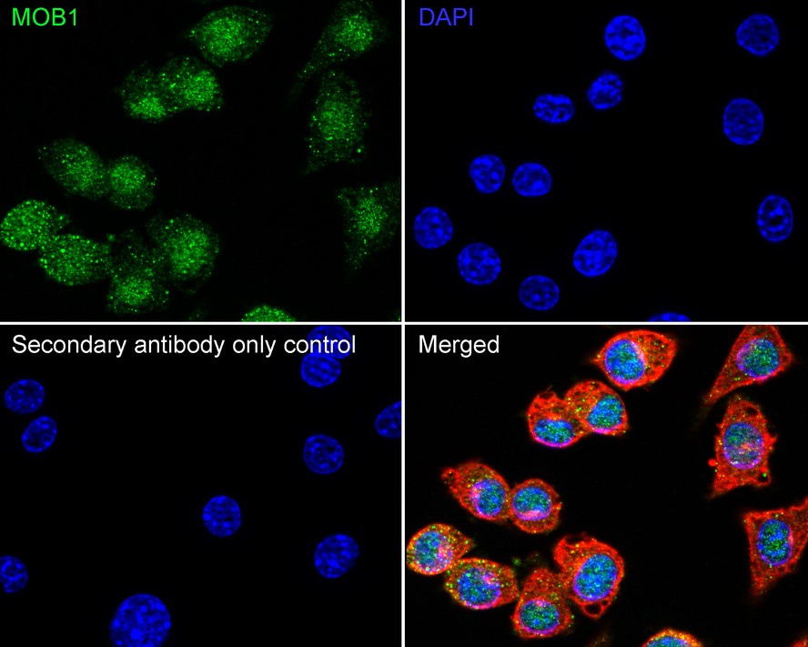 Cells were fixed in 4% paraformaldehyde for 15 minutes at room temperature, permeabilized with 0.1% Triton X-100 in PBS for 15 minutes at room temperature, then blocked with 1% BSA in 10% negative goat serum for 1 hour at room temperature. Cells were then incubated with Rabbit anti-MOB1 antibody (HA723919) at 1/50 dilution in 1% BSA in PBST overnight at 4 ℃. Goat Anti-Rabbit IgG H&L (iFluor™ 488, HA1121) was used as the secondary antibody at 1/1,000 dilution. PBS instead of the primary antibody was used as the secondary antibody only control. Nuclear DNA was labelled in blue with DAPI.
