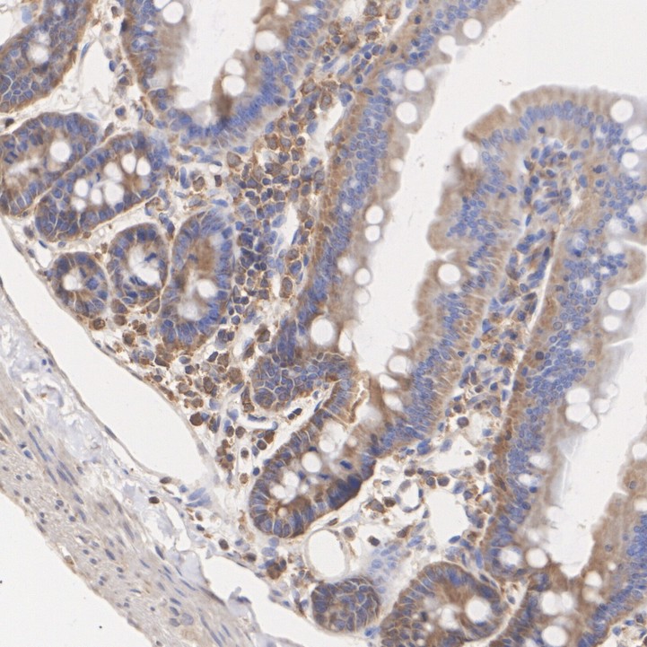 Immunohistochemical analysis of paraffin-embedded human small intestine tissue with Rabbit anti-MOB1 antibody (HA723919) at 1/1,000 dilution.