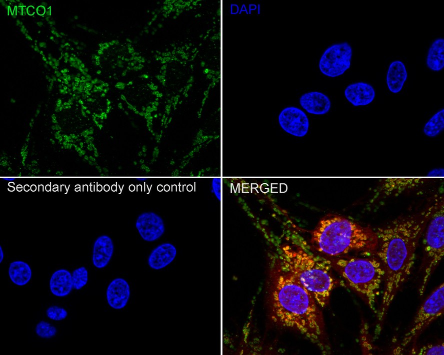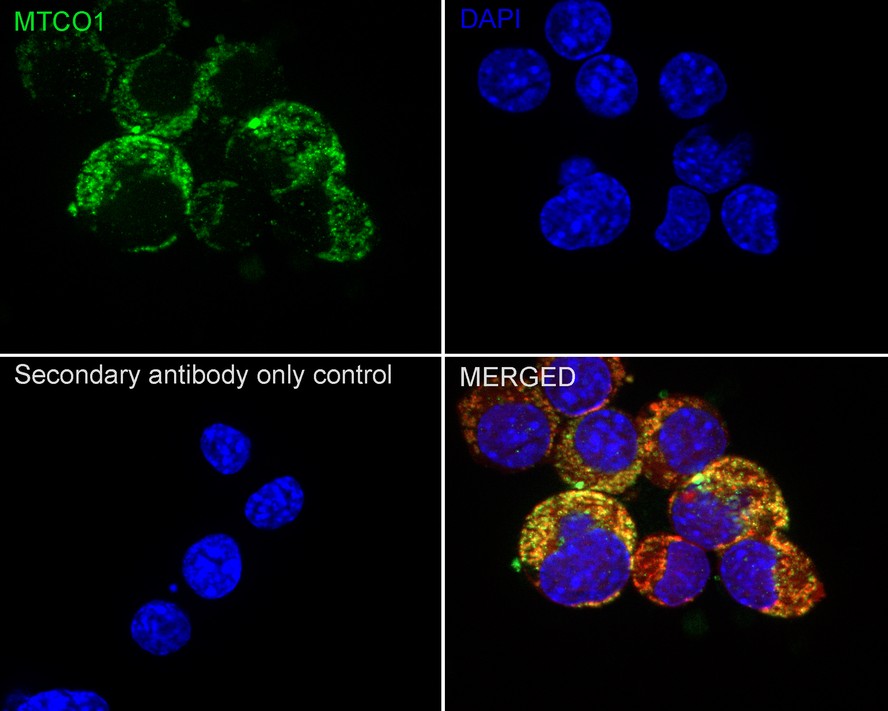 Cells were fixed in 4% paraformaldehyde for 20 minutes at room temperature, permeabilized with 0.1% Triton X-100 in PBS for 5 minutes at room temperature, then blocked with 1% BSA in 10% negative goat serum for 1 hour at room temperature. Cells were then incubated with Rabbit anti-MTCO1 antibody (HA751171) at 1/50 dilution in 1% BSA in PBST overnight at 4 ℃. Goat Anti-Rabbit IgG H&L (iFluor™ 488, HA1121) was used as the secondary antibody at 1/1,000 dilution. PBS instead of the primary antibody was used as the secondary antibody only control. Nuclear DNA was labelled in blue with DAPI.