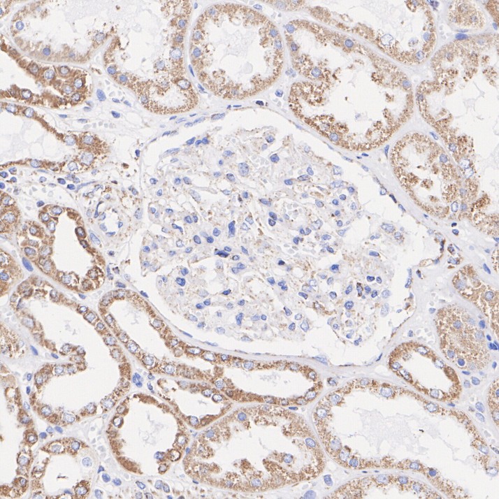 Immunohistochemical analysis of paraffin-embedded human kidney tissue with Rabbit anti-MTCO1 antibody (HA751171) at 1/10,000 dilution.