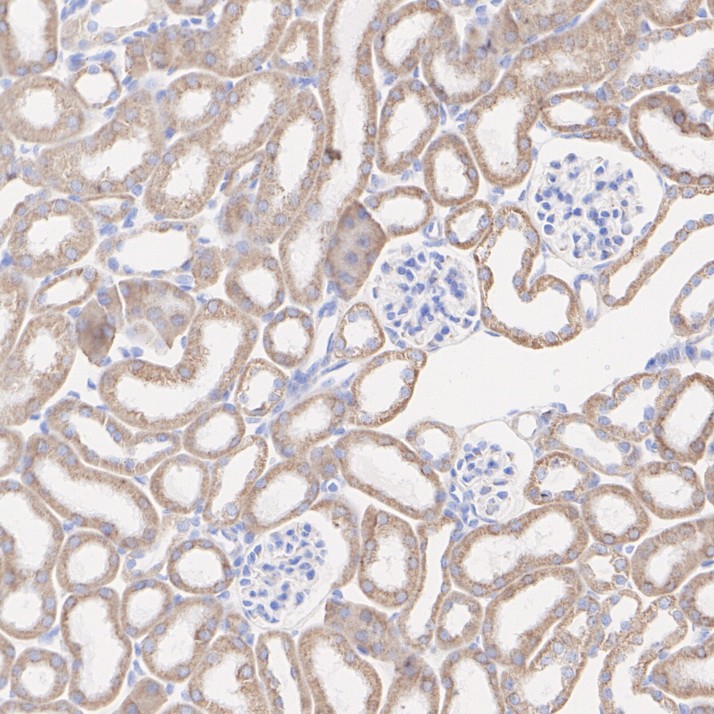 Immunohistochemical analysis of paraffin-embedded mouse kidney tissue with Rabbit anti-MTCO1 antibody (HA751171) at 1/10,000 dilution.