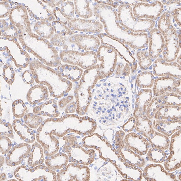 Immunohistochemical analysis of paraffin-embedded rat kidney tissue with Rabbit anti-MTCO1 antibody (HA751171) at 1/10,000 dilution.