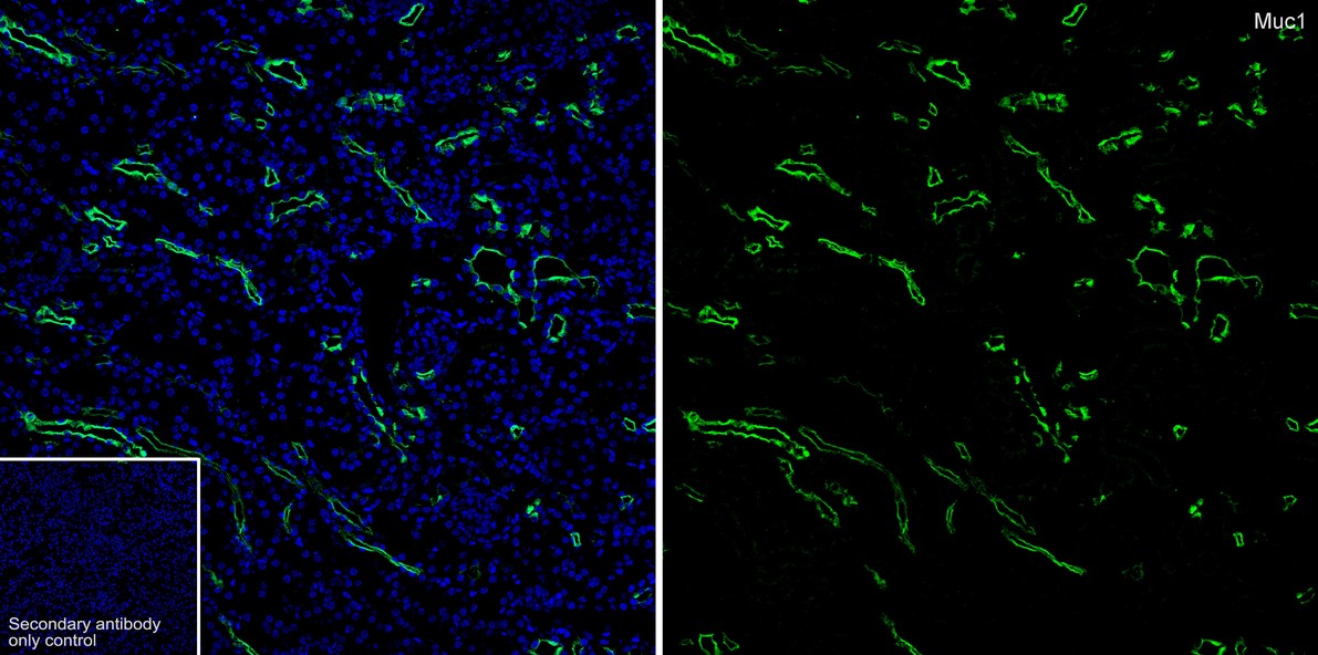 Immunohistochemical analysis of paraffin-embedded mouse kidney tissue with Rabbit anti-MUC1 antibody (ET1611-14) at 1/1,000 dilution.