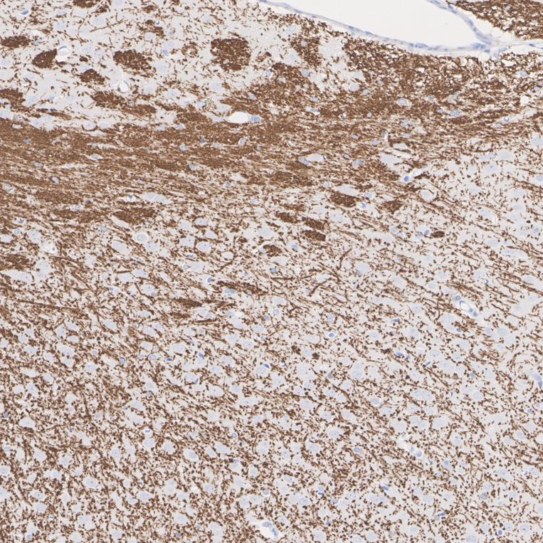 Immunohistochemical analysis of paraffin-embedded human brain tissue with Rabbit anti-Myelin PLP antibody (HA500202) at 1/2,000 dilution.