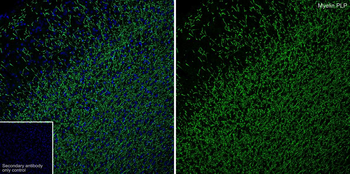 Immunofluorescence analysis of frozen mouse brain tissue with Rat anti-Myelin PLP antibody (HA601407) at 1/1,000 dilution.