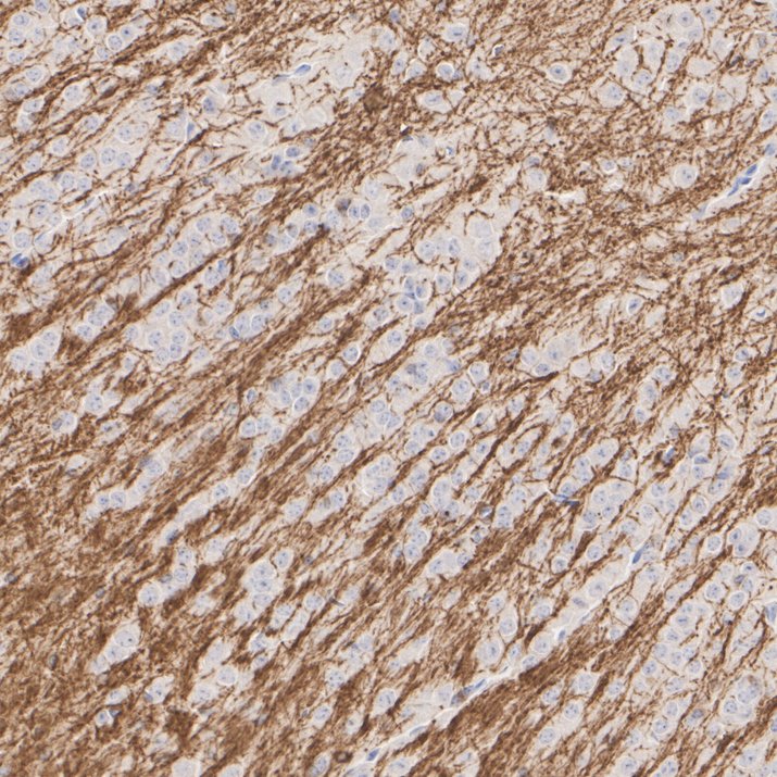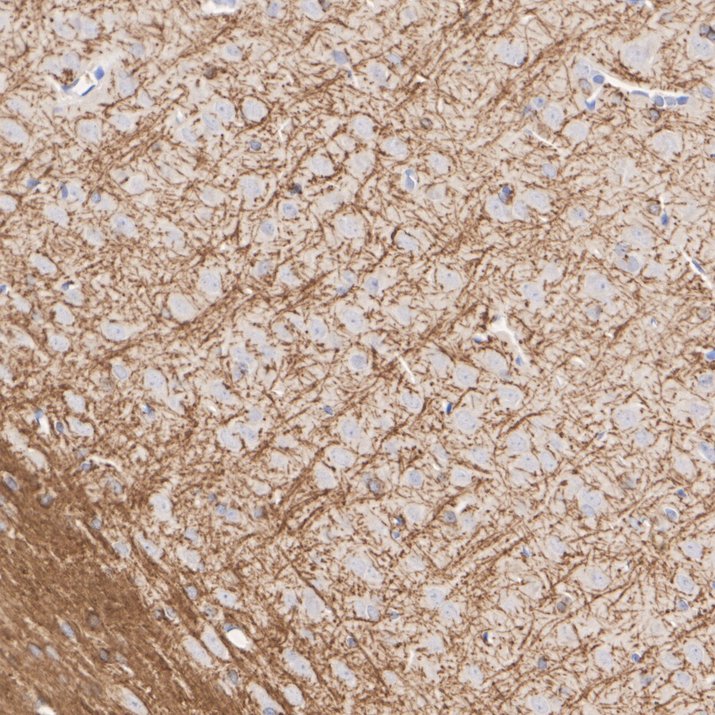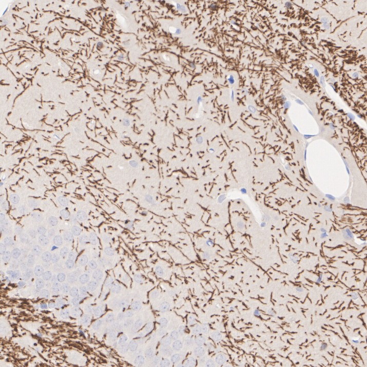 Immunohistochemical analysis of paraffin-embedded mouse brain tissue with Rat anti-Myelin PLP antibody (HA601407) at 1/1,000 dilution.