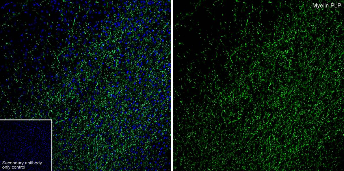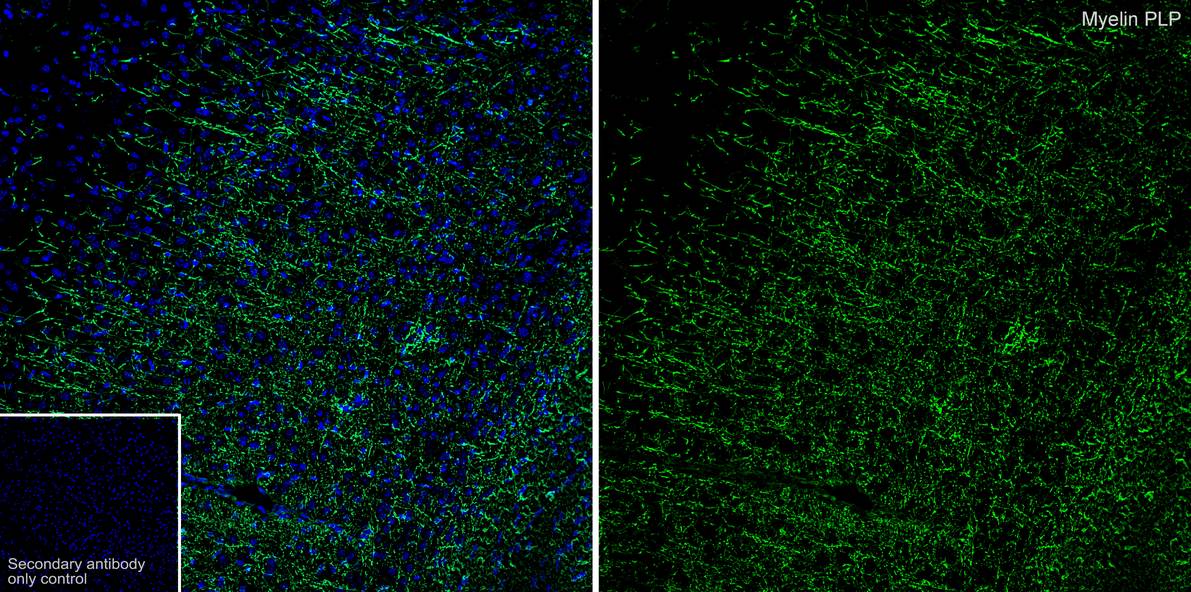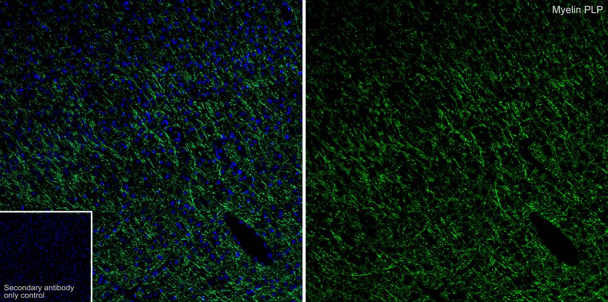 Immunofluorescence analysis of frozen mouse brain tissue with Rabbit anti-Myelin PLP antibody (HA751212) at 1/1,000 dilution.