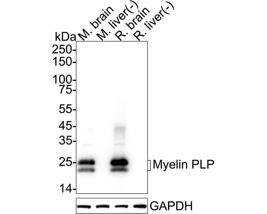 Western blot analysis of Myelin PLP on different lysates with Rabbit anti-Myelin PLP antibody (HA751212) at 1/5,000 dilution.