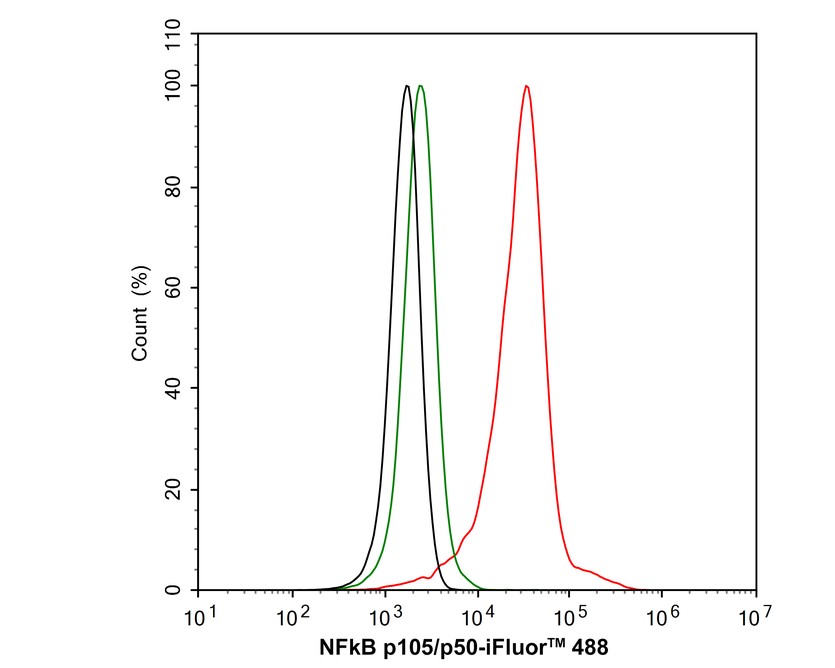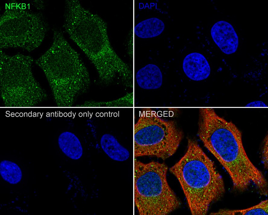 Cells were fixed in 4% paraformaldehyde for 20 minutes at room temperature, permeabilized with 0.1% Triton X-100 in PBS for 5 minutes at room temperature, then blocked with 1% BSA in 10% negative goat serum for 1 hour at room temperature. Cells were then incubated with Rabbit anti-NF-kB p105 / p50 antibody (HA750060) at 1/100 dilution in 1% BSA in PBST overnight at 4 ℃. Goat Anti-Rabbit IgG H&L (iFluor™ 488, HA1121) was used as the secondary antibody at 1/1,000 dilution. PBS instead of the primary antibody was used as the secondary antibody only control. Nuclear DNA was labelled in blue with DAPI.