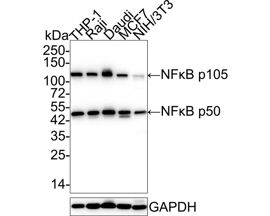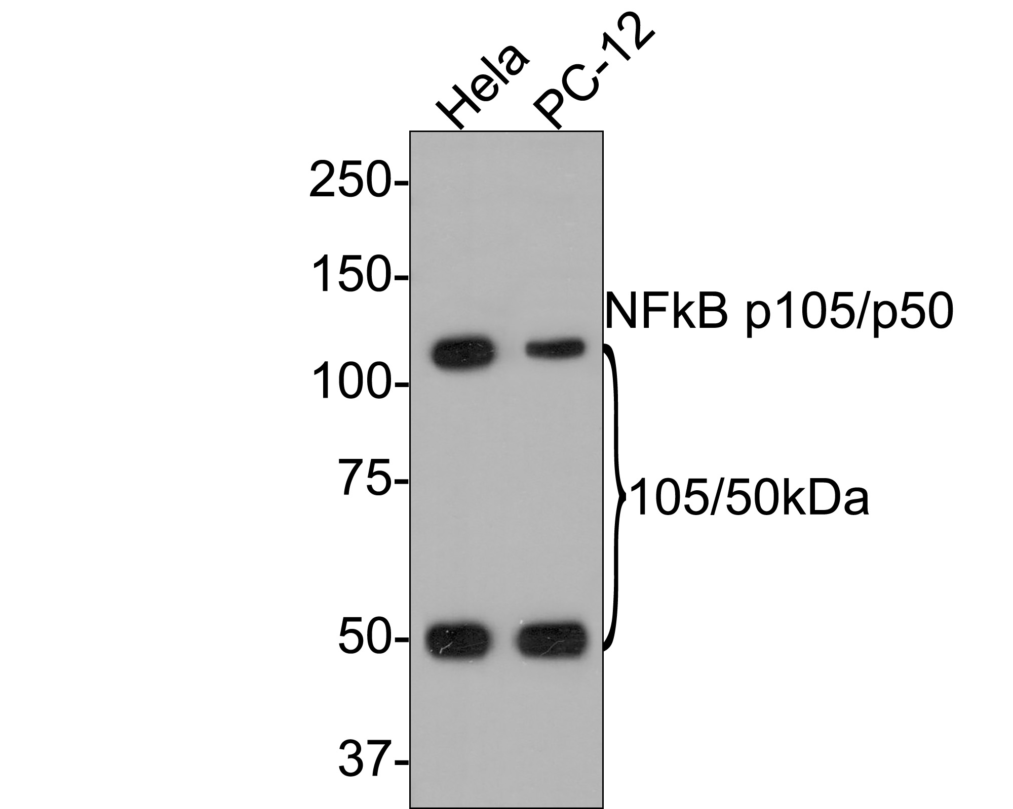 Western blot analysis of NF-kB p105 / p50 on different lysates with Rabbit anti-NF-kB p105 / p50 antibody (HA750060) at 1/5,000 dilution.