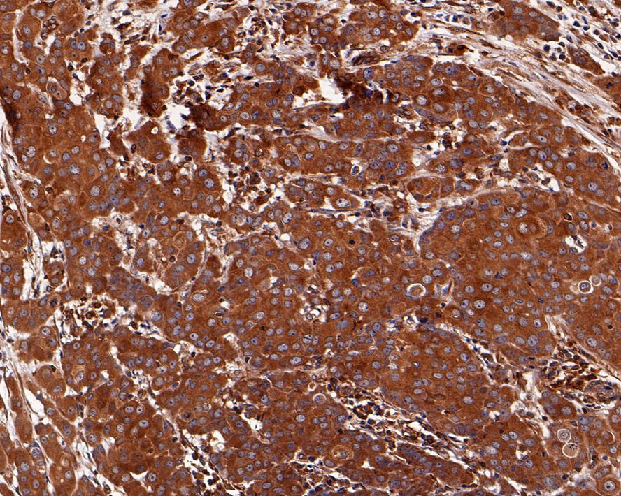 The section was pre-treated using heat mediated antigen retrieval with Tris-EDTA buffer (pH 9.0) for 20 minutes. The tissues were blocked in 1% BSA for 20 minutes at room temperature, washed with ddH2O and PBS, and then probed with the primary antibody (HA750060) at 1/1,000 dilution for 1 hour at room temperature. The detection was performed using an HRP conjugated compact polymer system. DAB was used as the chromogen. Tissues were counterstained with hematoxylin and mounted with DPX. -