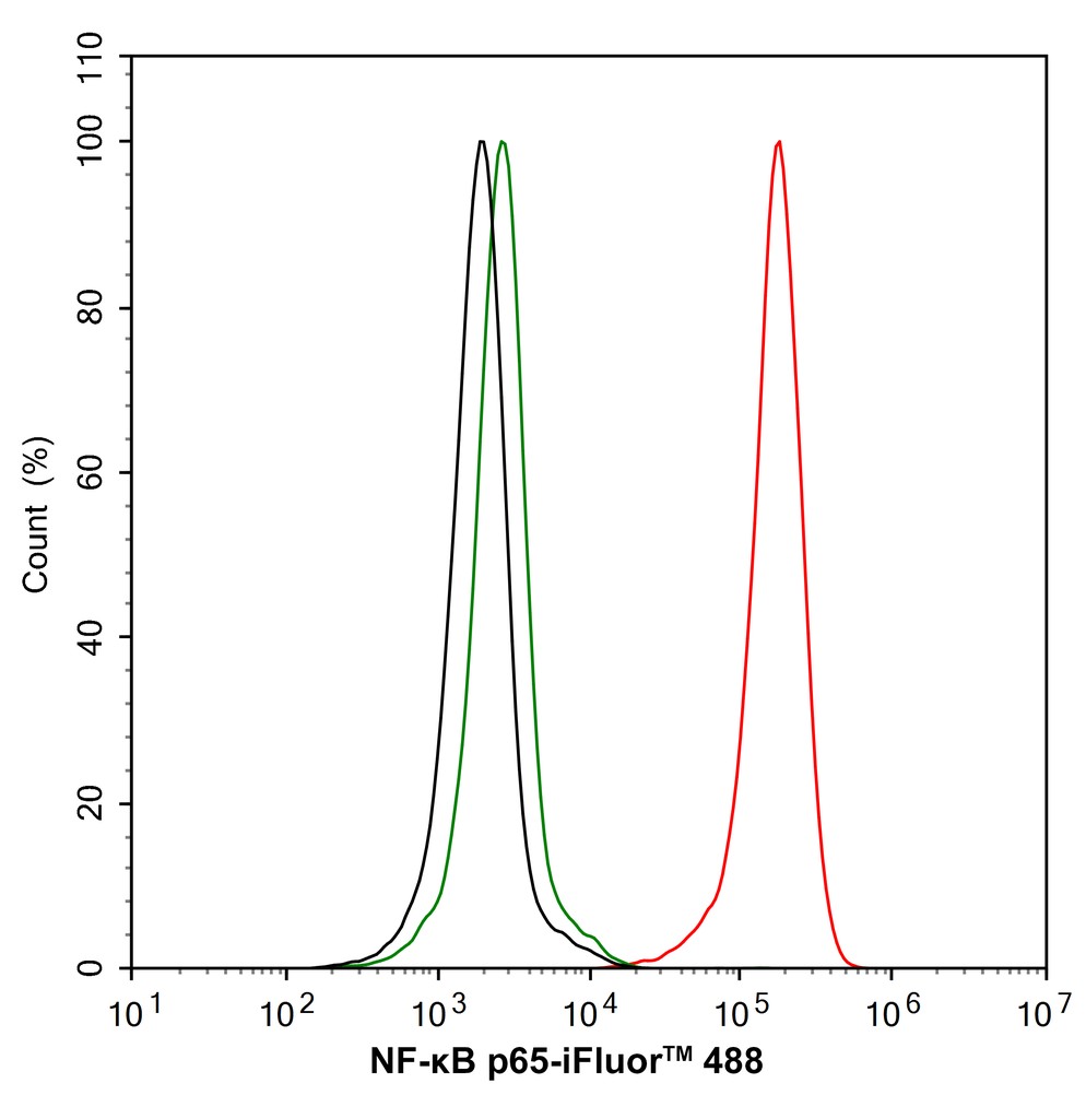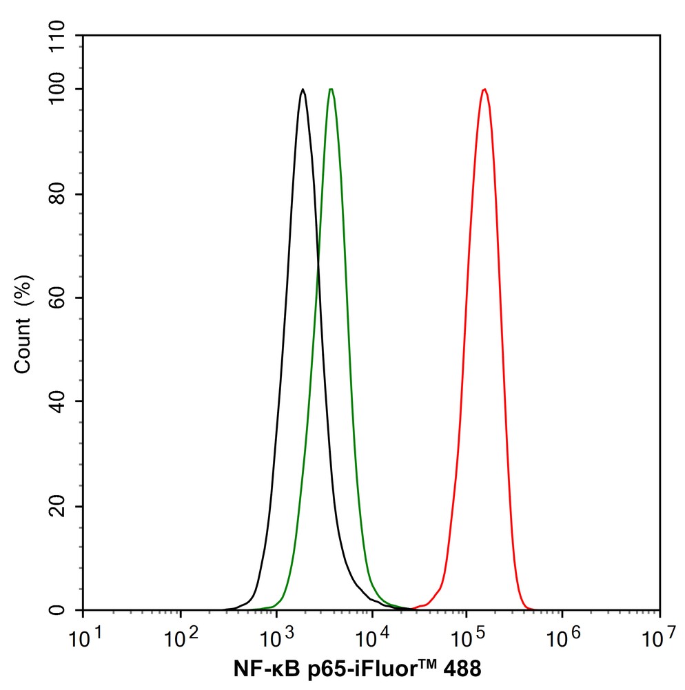 Cells were fixed and permeabilized. Then stained with the primary antibody (HA500402, 1/1,000) (red) compared with Rabbit IgG Isotype Control (green). After incubation of the primary antibody at +4℃ for an hour, the cells were stained with a iFluor™ 488 conjugate-Goat anti-Rabbit IgG Secondary antibody (HA1121) at 1/1,000 dilution for 30 minutes at +4℃. Unlabelled sample was used as a control (cells without incubation with primary antibody; black). -
