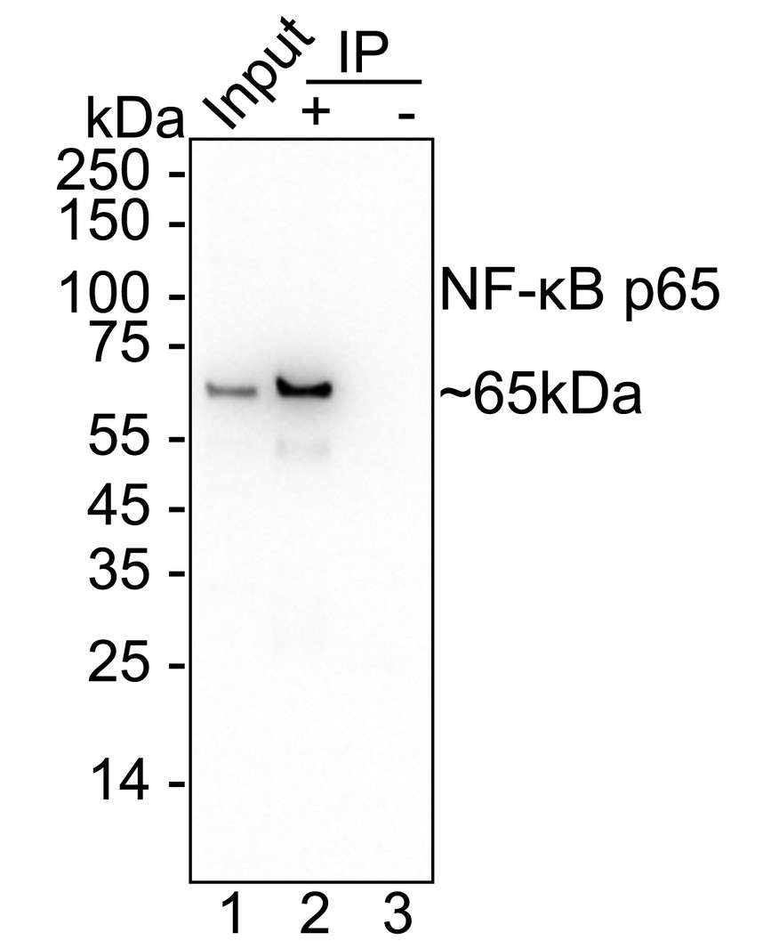 NF-kB p65 was immunoprecipitated from 0.2 mg HeLa cell lysate with HA500402 at 2 µg/10 µl beads. Western blot was performed from the immunoprecipitate using HA500402 at 1/5,000 dilution. HRP Conjugated Anti-Rabbit IgG for IP Nano-secondary antibody at 1/5,000 dilution was used for 1 hour at room temperature.