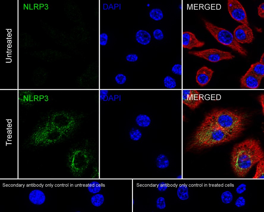 Cells were fixed in 4% paraformaldehyde for 15 minutes at room temperature, permeabilized with 0.1% Triton X-100 in PBS for 15 minutes at room temperature, then blocked with 1% BSA in 10% negative goat serum for 1 hour at room temperature. Cells were then incubated with Rabbit anti-NLRP3 antibody (HA750236) at 1/100 dilution in 1% BSA in PBST overnight at 4 ℃. Goat Anti-Rabbit IgG H&L (iFluor™ 488, HA1121) was used as the secondary antibody at 1/1,000 dilution. PBS instead of the primary antibody was used as the secondary antibody only control. Nuclear DNA was labelled in blue with DAPI.