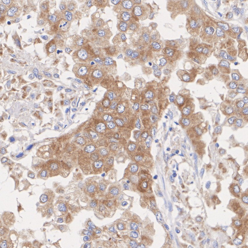 The section was pre-treated using heat mediated antigen retrieval with sodium citrate buffer (pH 6.0) (high pressure) for 2 minutes. The tissues were blocked in 1% BSA for 20 minutes at room temperature, washed with ddH2O and PBS, and then probed with the primary antibody (HA750236) at 1/400 dilution for 1 hour at room temperature. The detection was performed using an HRP conjugated compact polymer system. DAB was used as the chromogen. Tissues were counterstained with hematoxylin and mounted with DPX.