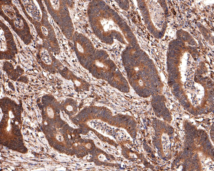 Immunohistochemical analysis of paraffin-embedded human colon carcinoma tissue with Rabbit anti-NLRP3 antibody (HA750236) at 1/400 dilution.