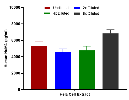 Interpolated concentration of native NuMA was measured in duplicate at different sample concentrations and interpolated from the NuMA standard curves. The interpolated dilution factor corrected values were plotted (mean +/- SD, n=2). The mean NuMA concentration was determined to be 5,378 pg/mL in Hela cell extract.