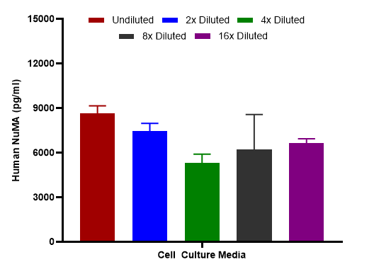 The concentrations of NuMA were measured in duplicates, interpolated from the NuMA standard curves and corrected for sample dilution. Undiluted samples are as follows: cell culture media 50%. The interpolated dilution factor corrected values are plotted (mean +/- SD, n=2).