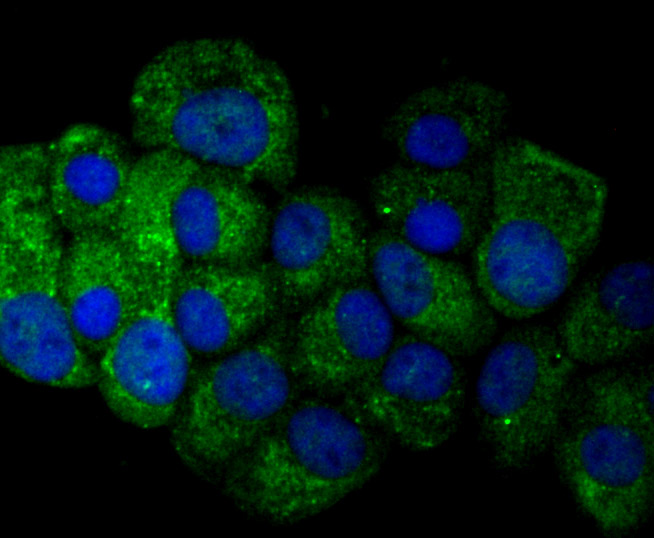 ICC staining Osteopontin in MCF-7 cells (green). The nuclear counter stain is DAPI (blue). Cells were fixed in paraformaldehyde, permeabilised with 0.25% Triton X100/PBS.