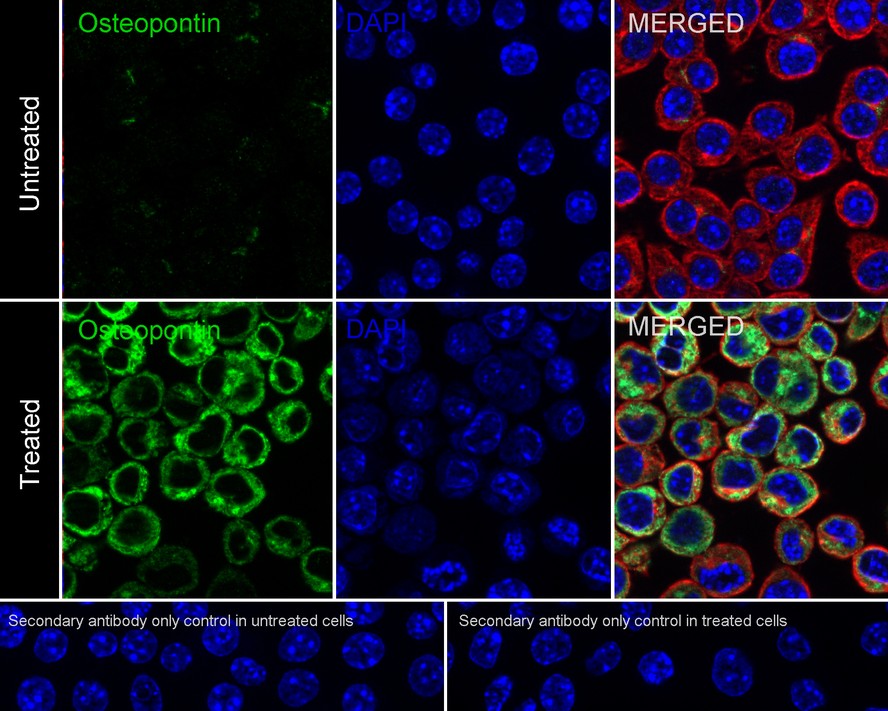 Immunocytochemistry analysis of RAW264.7 cells treated with LPS (100 ng/ml 6h) add BFA (300 ng/ml 3h) labeling Osteopontin with Rabbit anti-Osteopontin antibody (ER1802-16) at 1/100 dilution.