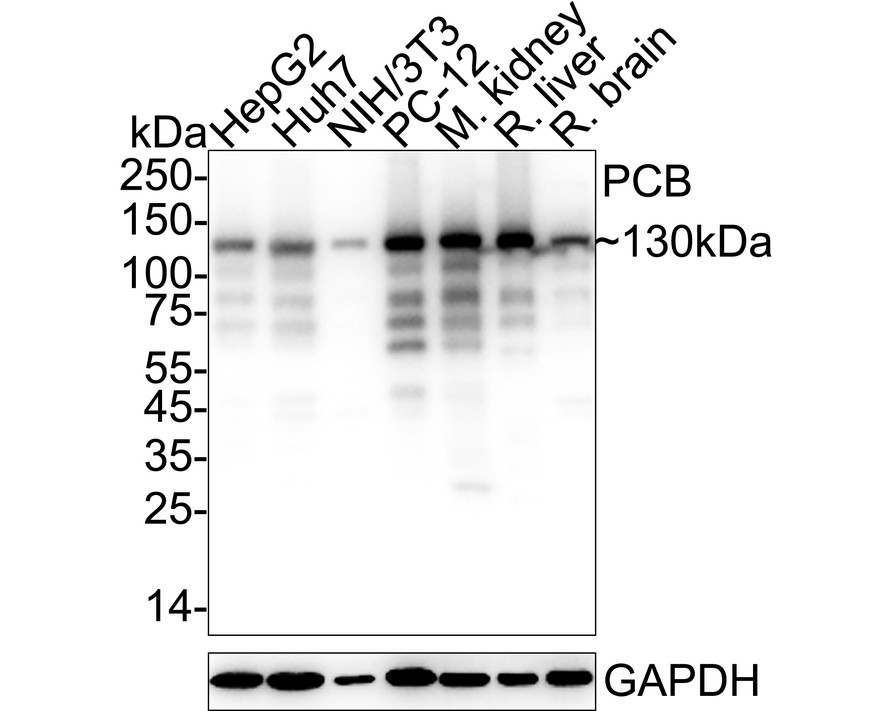 Western blot analysis of PCB on different lysates with Rabbit anti-PCB antibody (ER64531) at 1/10,000 dilution.