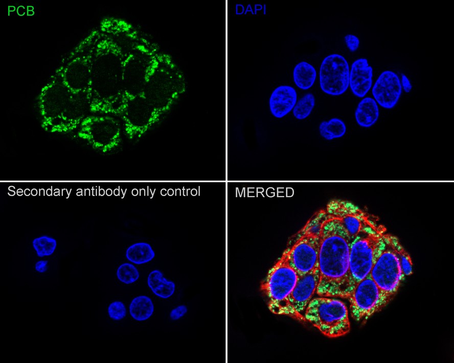 Cells were fixed in 4% paraformaldehyde for 15 minutes at room temperature, permeabilized with 0.1% Triton X-100 in PBS for 15 minutes at room temperature, then blocked with 1% BSA in 10% negative goat serum for 1 hour at room temperature. Cells were then incubated with Rabbit anti-PCB antibody (ER64531) at 1/500 dilution in 1% BSA in PBST overnight at 4 ℃. Goat Anti-Rabbit IgG H&L (iFluor™ 488, HA1121) was used as the secondary antibody at 1/1,000 dilution. PBS instead of the primary antibody was used as the secondary antibody only control. Nuclear DNA was labelled in blue with DAPI.