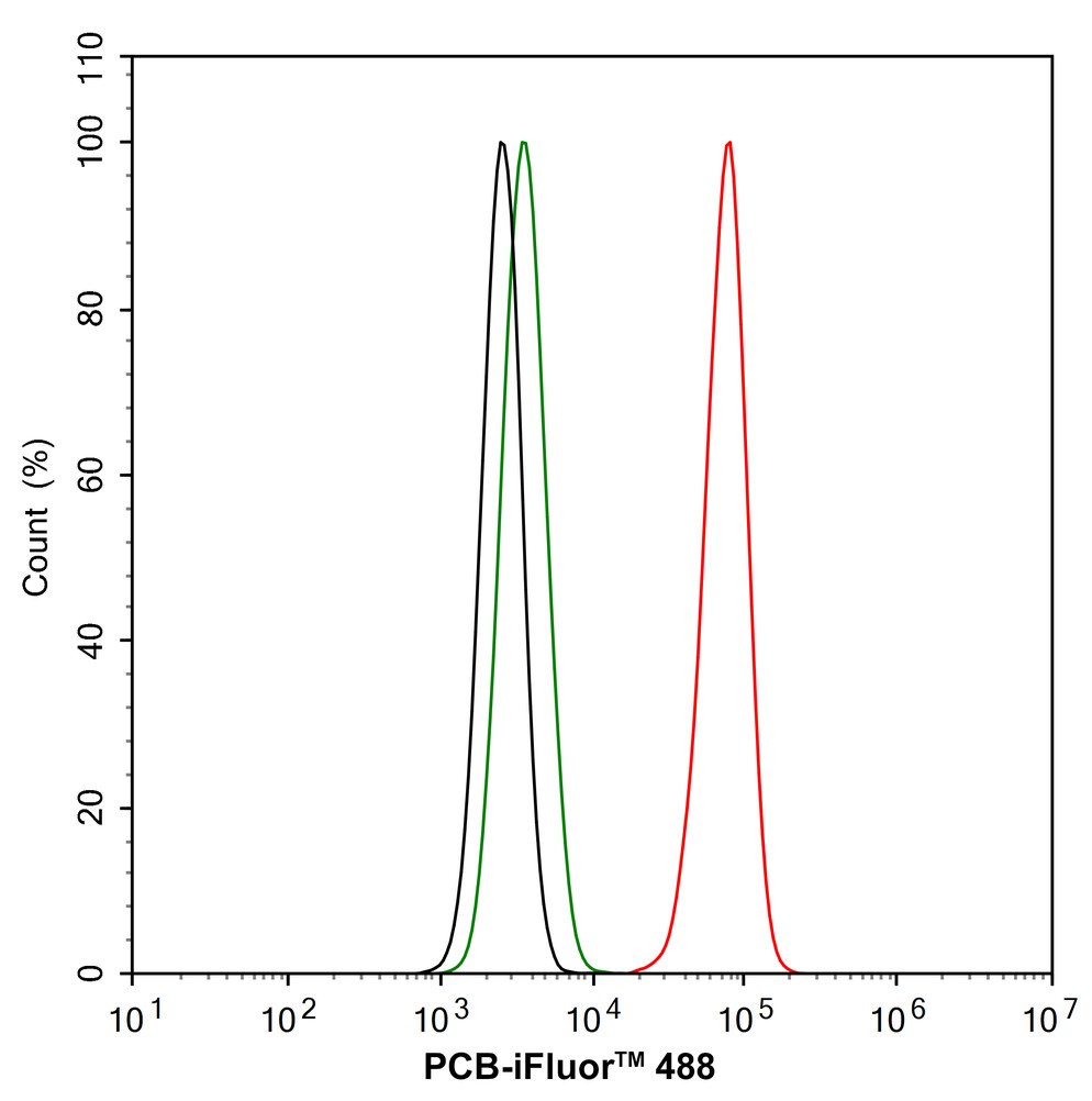 Cells were fixed and permeabilized. Then stained with the primary antibody (ER64531, 1/1,000) (red) compared with Rabbit IgG Isotype Control (green). After incubation of the primary antibody at +4℃ for an hour, the cells were stained with a iFluor™ 488 conjugate-Goat anti-Rabbit IgG Secondary antibody (HA1121) at 1/1,000 dilution for 30 minutes at +4℃. Unlabelled sample was used as a control (cells without incubation with primary antibody; black).