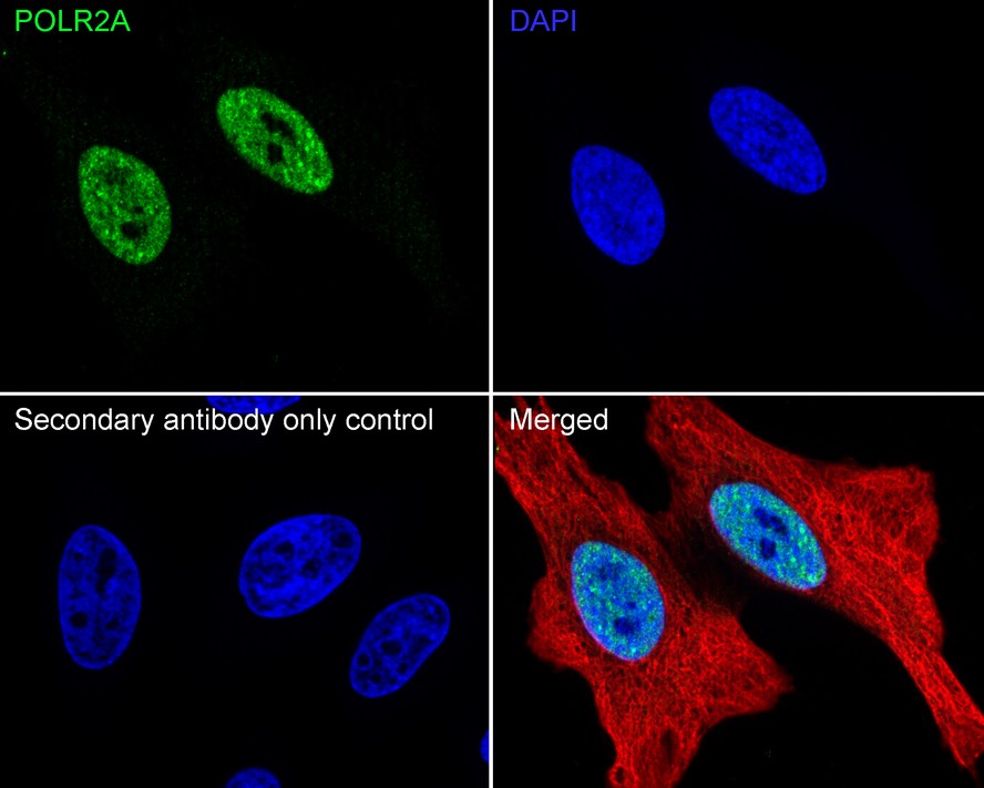 Cells were fixed in 4% paraformaldehyde for 15 minutes at room temperature, permeabilized with 0.1% Triton X-100 in PBS for 15 minutes at room temperature, then blocked with 1% BSA in 10% negative goat serum for 1 hour at room temperature. Cells were then incubated with Rabbit anti-POLR2A antibody (HA751666) at 1/200 dilution in 1% BSA in PBST overnight at 4 ℃. Goat Anti-Rabbit IgG H&L (iFluor™ 488, HA1121) was used as the secondary antibody at 1/1,000 dilution. PBS instead of the primary antibody was used as the secondary antibody only control. Nuclear DNA was labelled in blue with DAPI.