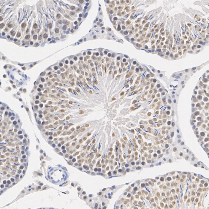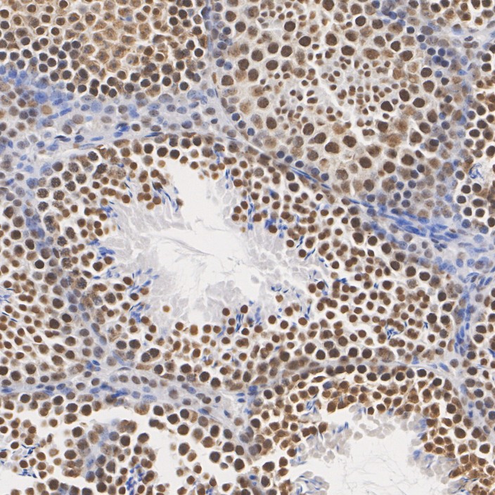 Immunohistochemical analysis of paraffin-embedded mouse testis tissue with Rabbit anti-POLR2A antibody (HA751666) at 1/1,000 dilution.