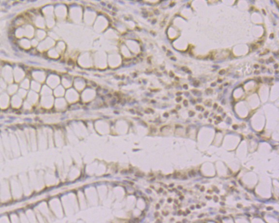 Immunohistochemical analysis of paraffin-embedded human colon tissue using anti-POLR2A antibody. The section was pre-treated using heat mediated antigen retrieval with sodium citrate buffer (pH 6.0) (high pressure) for 2 minutes. The tissues were blocked in 5% BSA for 30 minutes at room temperature, washed with ddH2O and PBS, and then probed with the primary antibody (HA500334, 1/50) for 30 minutes at room temperature. The detection was performed using an HRP conjugated compact polymer system. DAB was used as the chromogen. Tissues were counterstained with hematoxylin and mounted with DPX.