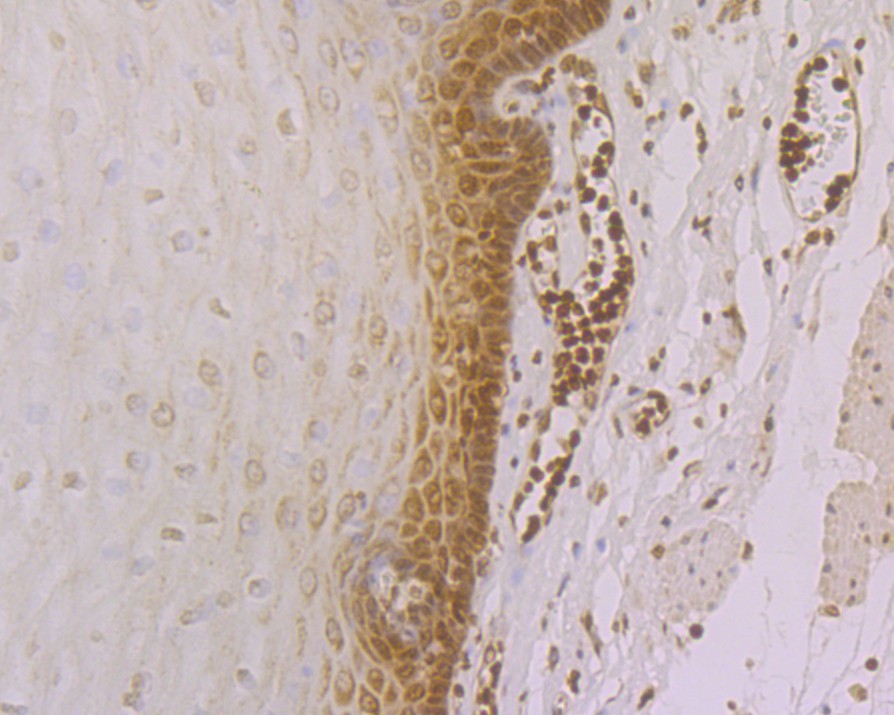Immunohistochemical analysis of paraffin-embedded human esophagus tissue using anti-POLR2A antibody. The section was pre-treated using heat mediated antigen retrieval with sodium citrate buffer (pH 6.0) (high pressure) for 2 minutes. The tissues were blocked in 5% BSA for 30 minutes at room temperature, washed with ddH2O and PBS, and then probed with the primary antibody (HA500334, 1/100) for 30 minutes at room temperature. The detection was performed using an HRP conjugated compact polymer system. DAB was used as the chromogen. Tissues were counterstained with hematoxylin and mounted with DPX.