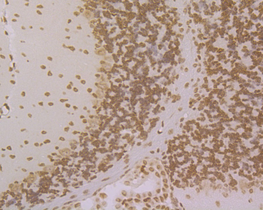 Immunohistochemical analysis of paraffin-embedded mouse brain tissue using anti-POLR2A antibody. The section was pre-treated using heat mediated antigen retrieval with sodium citrate buffer (pH 6.0) (high pressure) for 2 minutes. The tissues were blocked in 5% BSA for 30 minutes at room temperature, washed with ddH2O and PBS, and then probed with the primary antibody (HA500334, 1/200) for 30 minutes at room temperature. The detection was performed using an HRP conjugated compact polymer system. DAB was used as the chromogen. Tissues were counterstained with hematoxylin and mounted with DPX.