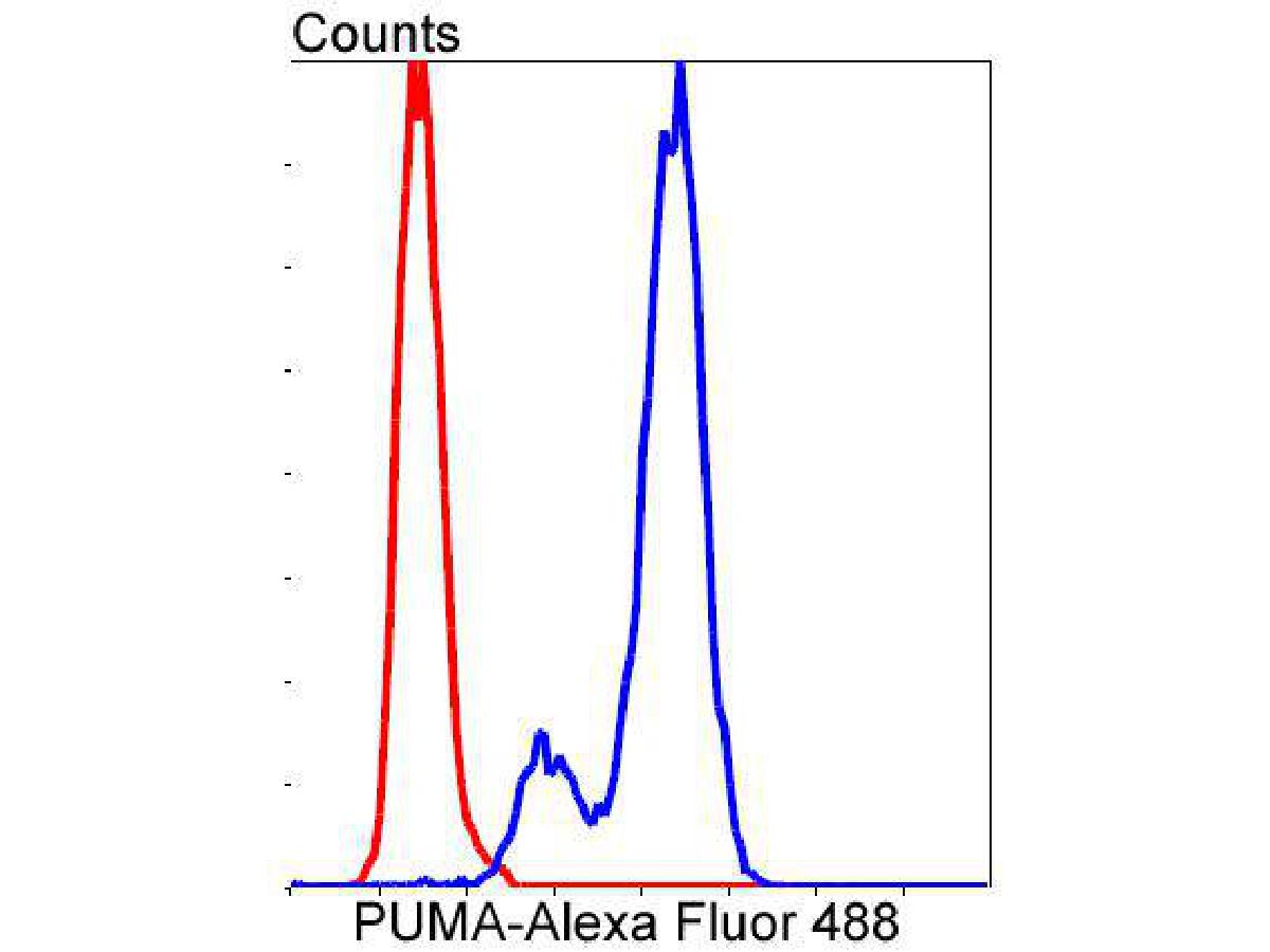 Flow cytometric analysis of PUMA was done on Hela cells. The cells were fixed, permeabilized and stained with the primary antibody (ET1602-24, 1/50) (blue). After incubation of the primary antibody at room temperature for an hour, the cells were stained with a Alexa Fluor 488-conjugated Goat anti-Rabbit IgG Secondary antibody at 1/1000 dilution for 30 minutes.Unlabelled sample was used as a control (cells without incubation with primary antibody; red).