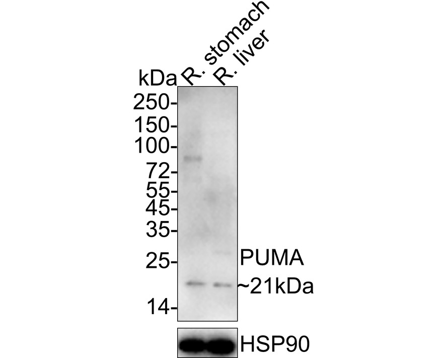 Western blot analysis of PUMA on different lysates with Rabbit anti-PUMA antibody (ET1602-24) at 1/1,000 dilution.