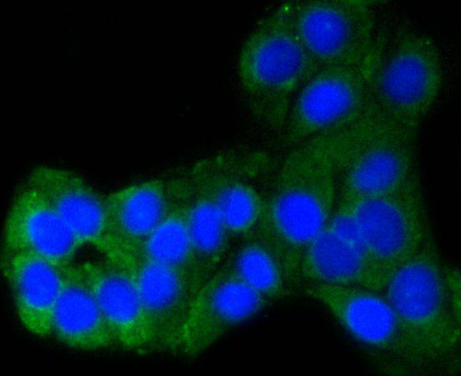 ICC staining of PUMA in SKOV-3 cells (green). Formalin fixed cells were permeabilized with 0.1% Triton X-100 in TBS for 10 minutes at room temperature and blocked with 1% Blocker BSA for 15 minutes at room temperature. Cells were probed with the primary antibody (ET1602-24, 1/50) for 1 hour at room temperature, washed with PBS. Alexa Fluor®488 Goat anti-Rabbit IgG was used as the secondary antibody at 1/1,000 dilution. The nuclear counter stain is DAPI (blue).