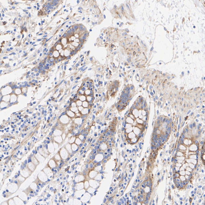Immunohistochemical analysis of paraffin-embedded human small intestine tissue with Rabbit anti-PUMA antibody (ET1602-24) at 1/10,000 dilution.