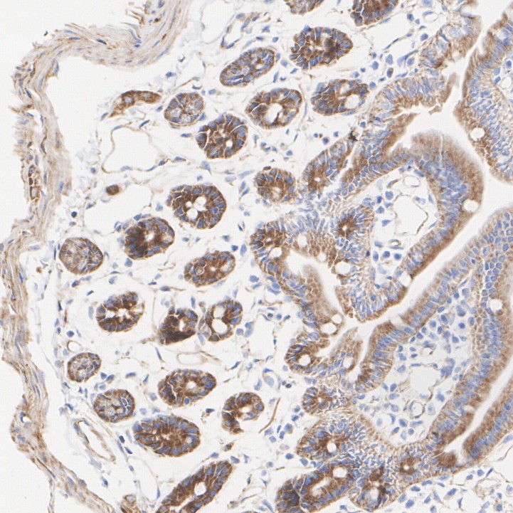 Immunohistochemical analysis of paraffin-embedded mouse small intestine tissue with Rabbit anti-PUMA antibody (ET1602-24) at 1/30,000 dilution.