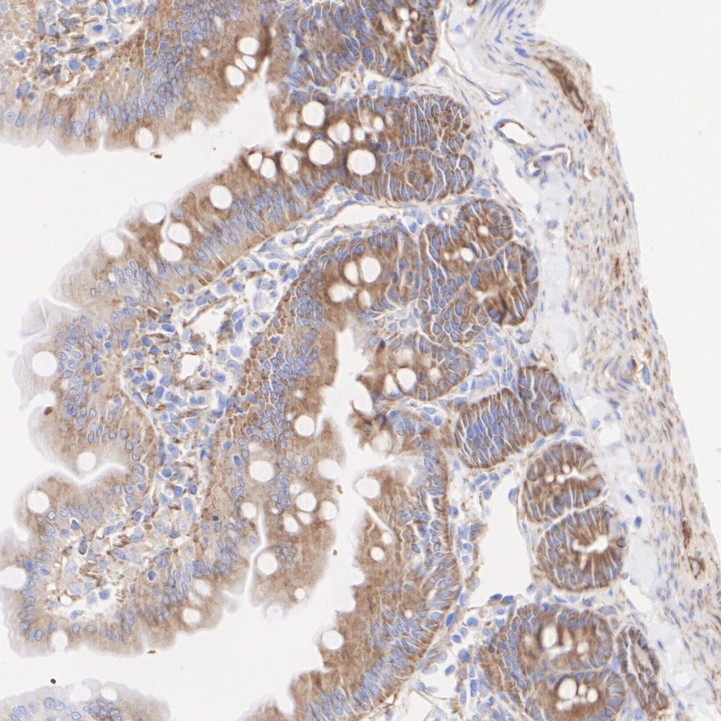 Immunohistochemical analysis of paraffin-embedded rat small intestine tissue with Rabbit anti-PUMA antibody (ET1602-24) at 1/30,000 dilution.