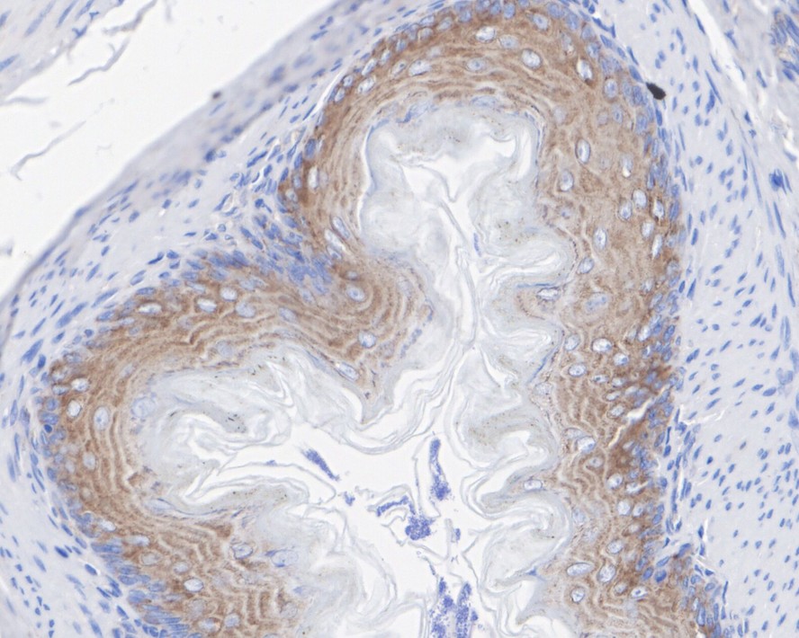 The section was pre-treated using heat mediated antigen retrieval with Tris-EDTA buffer (pH 9.0) for 20 minutes. The tissues were blocked in 1% BSA for 20 minutes at room temperature, washed with ddH2O and PBS, and then probed with the primary antibody (ET1602-24) at 1/2,000 dilution for 1 hour at room temperature. The detection was performed using an HRP conjugated compact polymer system. DAB was used as the chromogen. Tissues were counterstained with hematoxylin and mounted with DPX.